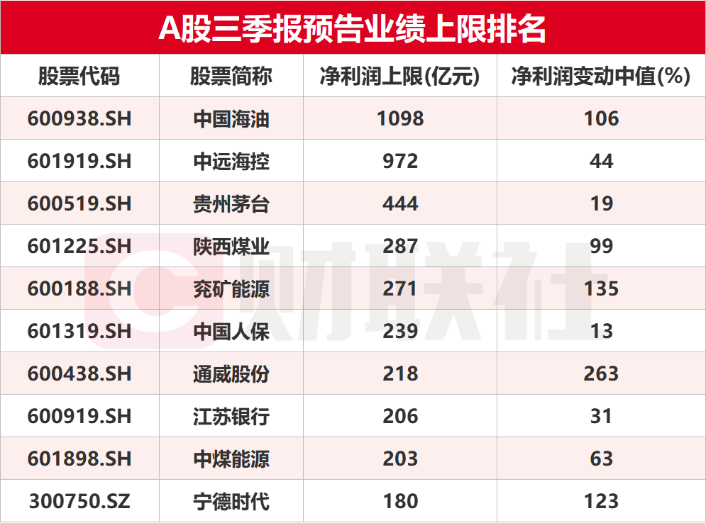 从三季报预告业绩上限前十排名来看,煤炭公司表现不俗,占据三席。其中,陕西煤业以287亿元的净利润上限排名第四,兖矿能源和中煤能源分别以271亿和203亿元的净利润上限排名第五和第九。