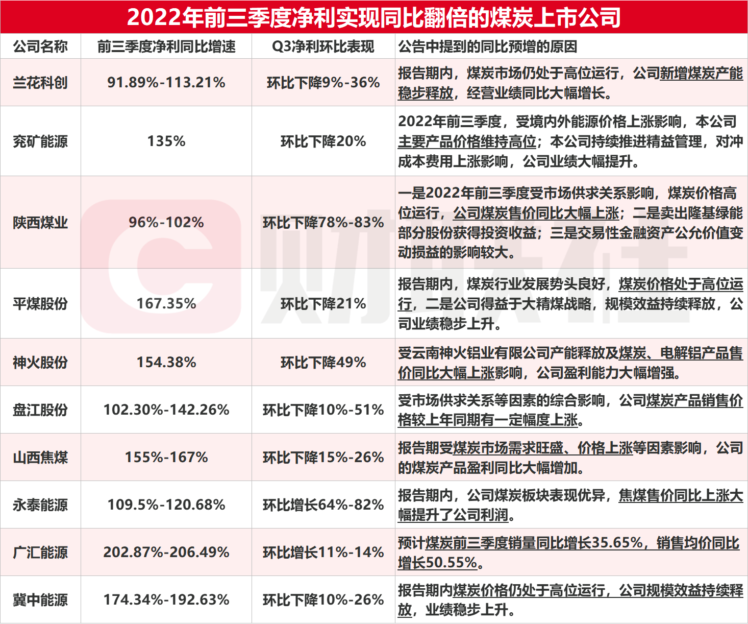据财联社不完全梳理煤炭行业三季报(包括预告和业绩快报),兰花科创、兖矿能源、陕西煤业、平煤股份、神火股份、盘江股份、山西焦煤、永泰能源、广汇能源和冀中能源等十家公司前三季度净利实现同比翻倍,但三季度净利环比表现出现分化,只有永泰能源和广汇能源环比实现正增长。