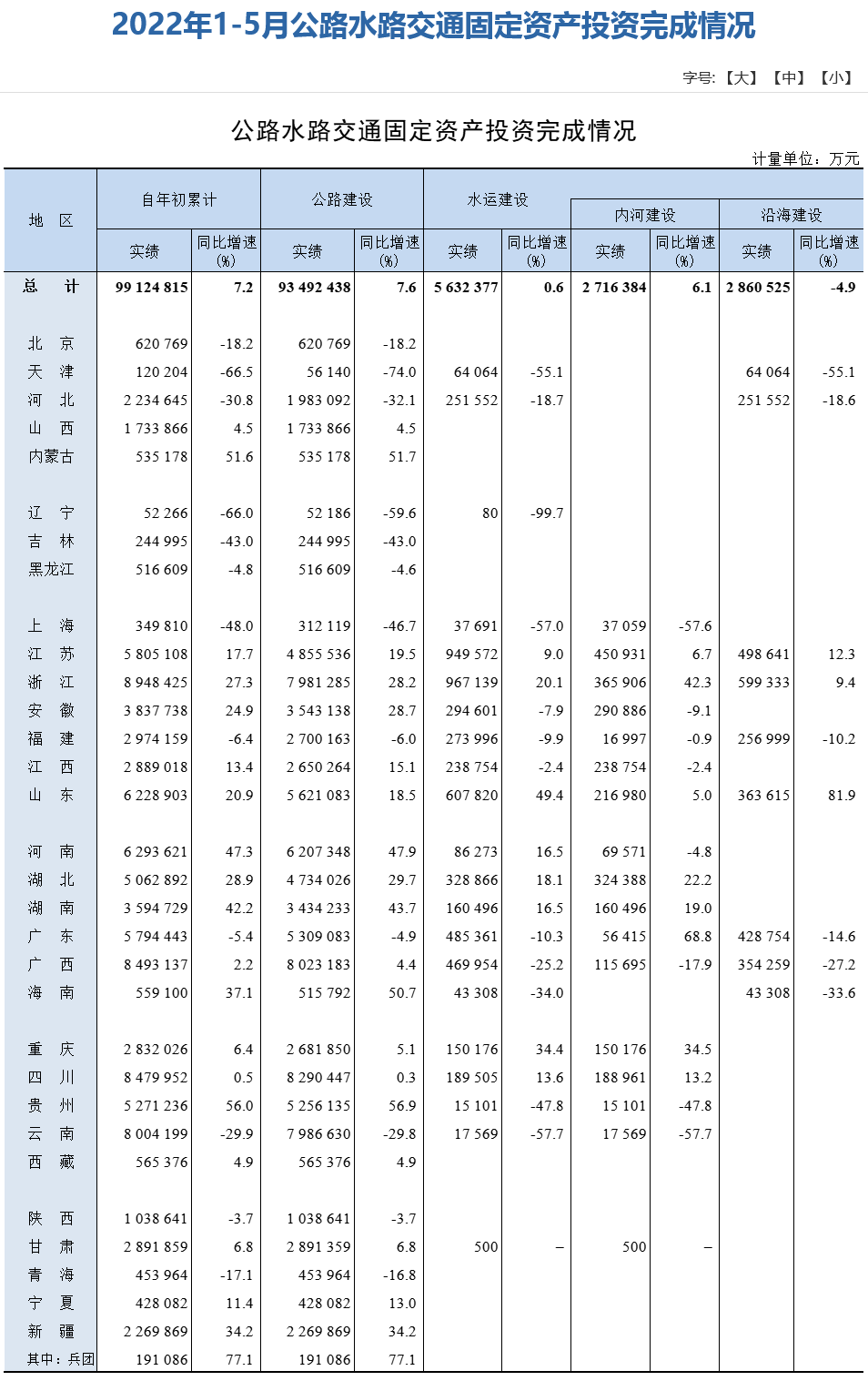 6月15日,交通运输部发布消息,2022年1-5月我国公路水路交通固定资产投资超9912亿元,同比增长7.2%。其中公路建投资达9349亿元,同比增长7.6%;内河建设投资近272亿元,同比增长6.1%;沿海建设投资达286亿元,同比下降4.9%。