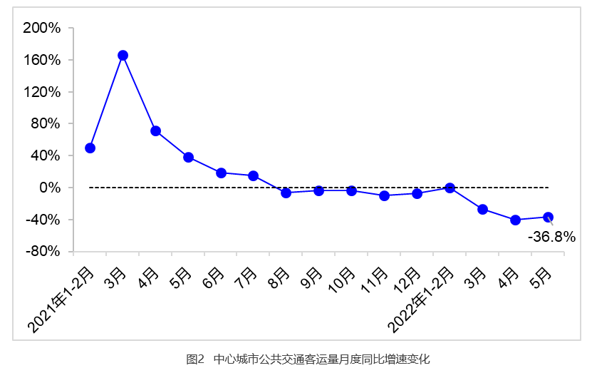 5月,36个中心城市完成客运量30.7亿人,同比下降36.8%、降幅较4月收窄3.1个百分点。分方式看,公共汽电车、城市轨道交通、巡游出租车、轮渡客运量分别完成13.5亿人、12.8亿人、4.4亿人和224万人,同比分别下降35.7%、39.7%、30.8%和55.9%,降幅较4月分别收窄3.1个、1.1个、9.7个和6.1个百分点。