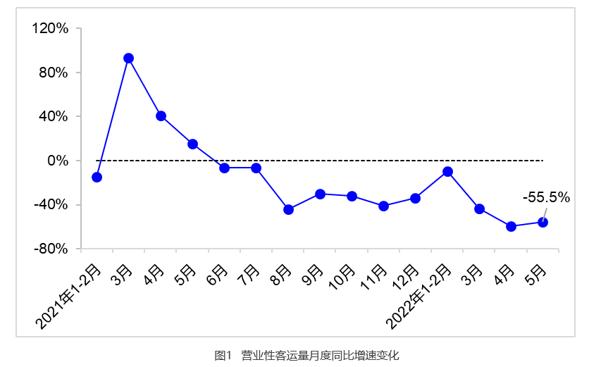 5月,完成营业性客运量3.8亿人,同比下降55.5%、降幅较4月收窄4.2个百分点。其中,完成公路营业性客运量2.7亿人,同比下降44.7%、降幅与4月基本持平;完成水路客运量664万人,同比下降69.1%、降幅较4月收窄7.1个百分点。