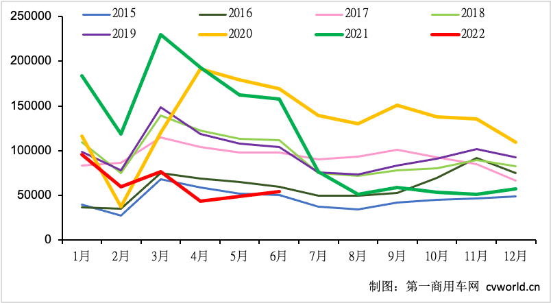 2015-2022年我国重卡市场销量月度走势图(单位:辆)