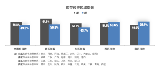 从区域指数情况看:6月全国总指数为49.5%,北区指数为50.8%,东区指数为43.7%,西区指数为56.6%,南区指数为57.6%。政策助力下,北区、东区车市快速恢复,两区库存预警指数进入或接近景气区间;南方大范围迎来持续强降雨,广东、江西等多地暴发洪水,南区库存预警指数上升。
