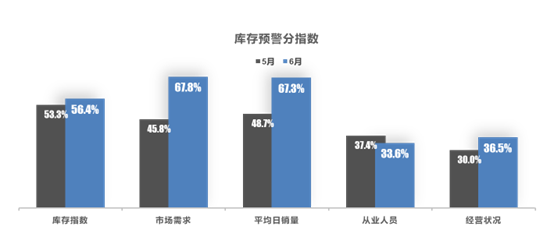 从分指数情况看:6月库存、市场需求、平均日销量、经营状况指数环比上升,从业人员指数环比下降。密集出台的促消费政策在短期内提升消费信心,经销商客流及成交情况明显好转,经营状况好于上月。