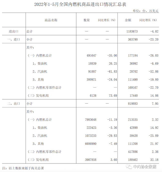 由于内燃机行业受国际贸易影响和自身企业规模的特性,其进出口表现不及国家整体情况。1-5月内燃机行业进出口总额118.37亿美元,同比下降4.02%。其中,进口36.38亿美元,同比下降23.20%;出口81.99亿美元,同比增长7.95%。