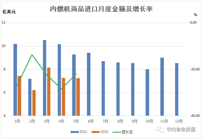 在进口金额中,除发电机组同比增长外其余各类均为下降,特别是汽油机下降较大。具体为:2022年1-5月柴油机进口3.70亿美元,同比下降6.69%;汽油机进口2.87亿美元,同比下降52.86%;其他类整机进口11.15亿美元,同比下降19.80%;内燃机零部件进口16.92亿美元,同比下降22.70%;发电机组进口1.74亿美元,同比增长14.06%。