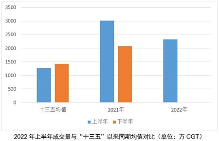 2022年上半年,世界新造船市场没有延续去年前半年的高光表现,继续创造新的成交纪录。完工交付也出现较大下滑,只有手持订单继续攀升,修正总吨(CGT)计实现“破亿”。根据中国船协统计数据,1-6月,世界新造船市场成交2331万CGT,同比下降14.5%,但仍比“十三五”同期均值高出82.8%;完工交付1411万CGT,同比下降11.4%;截至6月底,世界手持订单达到1.01亿CGT,同比增长23.2%。