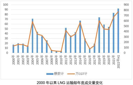 2022年1-6月,气体船成交798万CGT,同比增加127%,占全球新造船市场总量的37.1%,与集装箱船(份额38.7%)一起成为支撑上半年市场的绝对主力。其中,17.4万方以上的大型液态天然气(LNG)运输船半年成交量超过90艘,已经创造了该船型投入市场以来的年度新纪录。与箱船去年开始的突然爆发不同,气体船市场是从2018年开始随着世界能源消费结构向清洁能源转型稳步扩大的。近五年来,LNG运输船的市场成交量稳居前三,市场份额稳定在20%以上;世界排名前十的造船厂有6家开展大型LNG运输船建造业务;主要货主汇集了全球大部分能源巨头。未来,随着能源结构转型加速、海洋新能源开发扩大,以LNG、液态二氧化碳(LCO2)、液氢(LH2)等新型液态气体介质的运输船也将崛起为影响新造船市场格局的“新要素”。