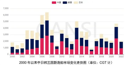 2022年上半年,中国造船三大指标继续领跑世界,其中新接订单量按CGT计占世界的47.7%。同期,韩国市场份额占世界的42.7%,中韩两国新接市场份额达到89.7%,这是本世纪以来世界首次前两个造船国家的市场份额接近90%。日本作为原来世界造船的“另一极”如今份额显著下降,欧洲在邮轮市场受疫情影响后仍徘徊在低谷,世界造船格局调整是否就此告一段落?纵观国际海事工业发展,当前的主题是“绿色、安全、智能和高效”,世界主要海洋强国都在向满足这一更高要求聚焦。不仅中韩两国,日本、欧洲在绿色、智能领域的新技术与装备也频频出镜,未来产业格局有“一锤定音”的可能,但更大概率还是“沉舟侧畔千帆过,病树前头万木春”般的创新与超越。