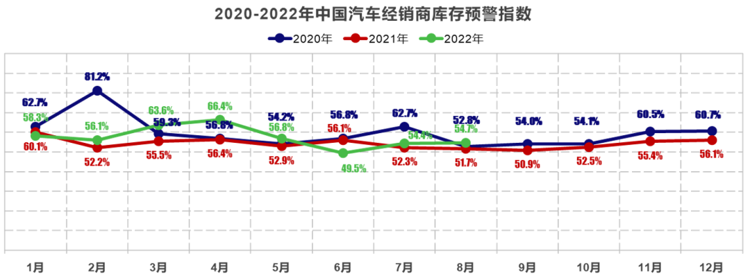 2022年8月31日,中国汽车流通协会发布的最新一期“中国汽车经销商库存预警指数调查”VIA(Vehicle Inventory Alert Index)显示,2022年8月中国汽车经销商库存预警指数为54.7%,同比上升3.0个百分点,环比上升0.3百分点,库存预警指数位于荣枯线之上。