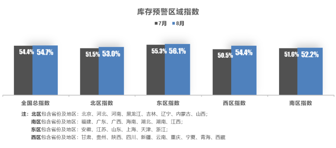 从区域指数情况看:8月全国总指数为54.7%,北区指数为53.0%,东区指数为56.1%,西区指数为54.4%,南区指数为52.2%。