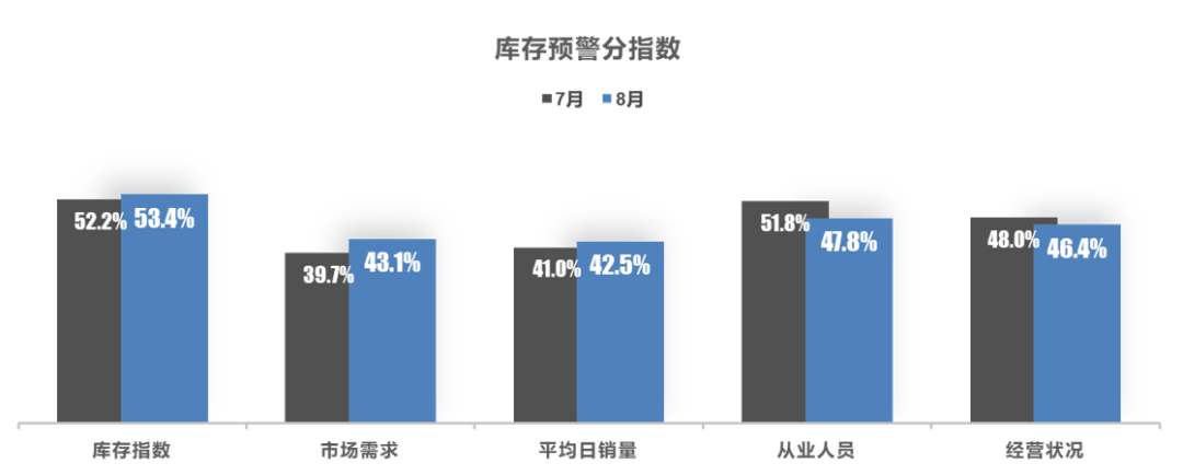 从分指数情况看:8月库存、市场需求、平均日销量指数环比上升,从业人员、经营状况指数环比下降。