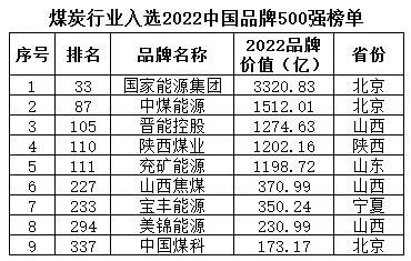 煤炭行业共有9家企业入选《2022中国品牌500强》。具体名单如下: