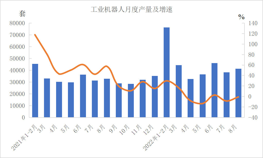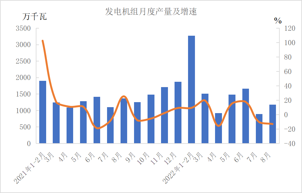 分产品看,1-8月份,金属切削机床38万台,下降10.5%;工业机器人277536套,下降10.5%;汽车1735.8万辆,增长6.1%,其中新能源汽车407.4万辆,增长110.1%;发电机组(发电设备)9602万千瓦,增长2.8%。