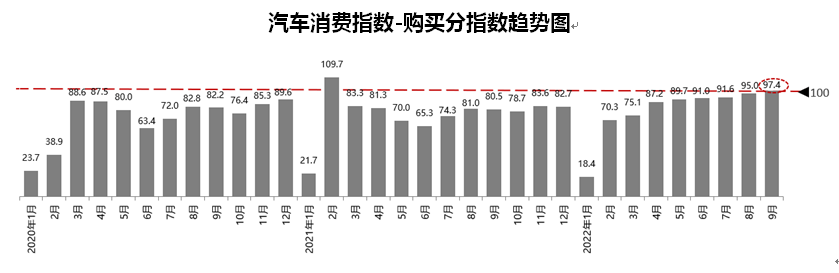 2022年9月购买分指数为97.4,高于上月。随着车辆购置税减征政策拉动作用增强,区域激励政策的延续,厂商促销力度的加大,还有消费者购车需求的增加,10月汽车市场将延续增长势头,预期10月汽车购买情况会有持续向好。
