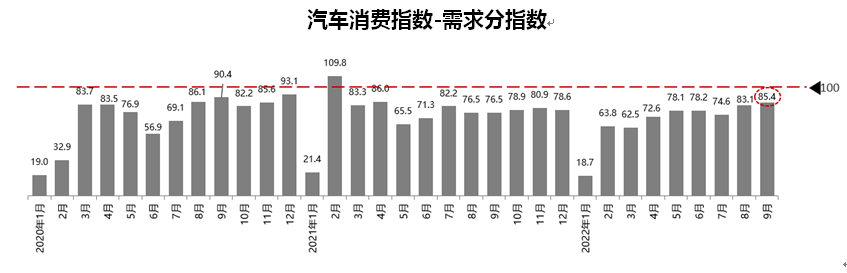 从构成汽车消费指数的分指数看,2022年9月需求分指数为85.4,高于上月,预期10月购车需求会有所增长。10月是传统的汽车销售旺季,用车需求增加,还有部分地区会举办车展等促销活动,外加促销政策的持续作用会使购车需求进一步提升。
