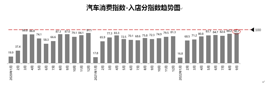 2022年9月入店分指数为90.7,高于上月,预期10月入店购车人数增加。10月秋高气爽温度适宜,外出购物的人数会有所增加。同时,10月国庆假期给客户出行购物提供了便利,经销商也抓住此时机开展大力度促销活动吸引更多客户进店购车。