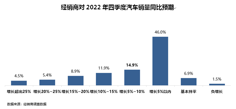 各种利好因素促进汽车销量持续提升,本月通过对经销商调查有92%的经销商认为四季度汽车销量会高于去年同期,认为销量下降的经销商不到2%。在预期销量增长的经销商中,认为增长幅度在5%-10%的经销商占比约为15%。