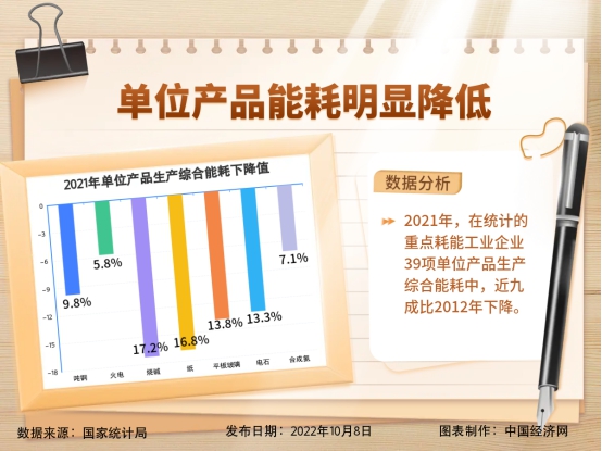 通过推动工艺升级、更新改造用能设备、加快淘汰落后产能、推广高效节能技术,单位产品综合能耗不断下降。2021年,在统计的重点耗能工业企业39项单位产品生产综合能耗中,近九成比2012年下降。其中,吨钢综合能耗下降9.8%,火力发电煤耗下降5.8%,烧碱、机制纸及纸板、平板玻璃、电石、合成氨生产单耗分别下降17.2%、16.8%、13.8%、13.3%、7.1%。