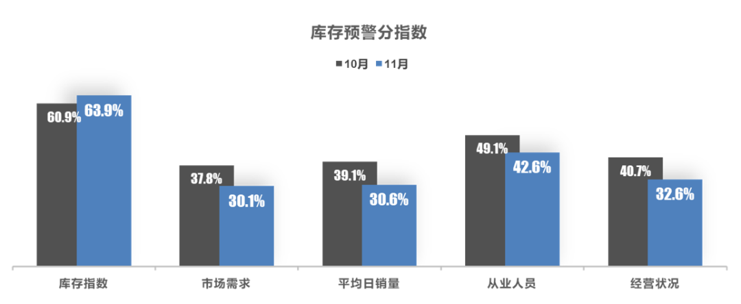 从分指数情况看:调查显示,11月库存指数环比上升,市场需求、平均日销量、从业人员、经营状况指数环比下降。