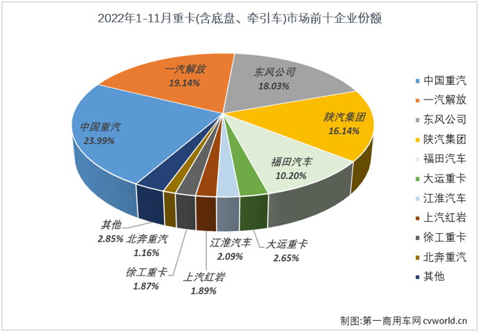 11月份,重汽蝉联重卡市场月销量榜冠军。2022年1-11月,解放、东风、重汽和陕汽四家企业均尝到过重卡市场月榜冠军的滋味,市场整体虽持续低迷,但榜首之争却颇有看点。第一商用车网还注意到,11月份重卡市场整体来看环比下降3%,具体到销量前十企业来看涨跌各半,5家企业11月份销量较10月份有所下滑,另5家企业则实现增长,陕汽、东风、江淮、北奔和大运11月份销量环比分别增长了15%、2%、149%、127%和11%。