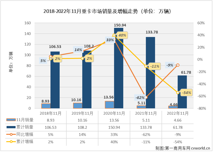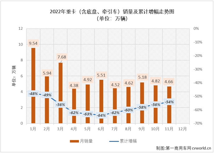 11月份,重卡市场销量再次遭遇环比、同比双降,面对去年同期仅5.11万辆的全年最低月销量,重卡市场仍然没能盼来2022年的首次增长。
