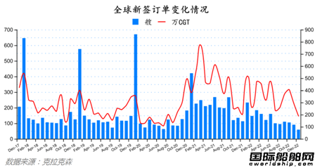 根据克拉克森最新数据统计(截至2023年1月10日),2022年12月份全球新签订单59艘,共计1899159CGT。与2022年11月份全球新签订单91艘,共计2933116CGT相比较,数量环比减少32艘,修正总吨环比下降35.25%。与2021年12月份全球新签订单113艘,共计2069691CGT相比较,数量同比减少54艘,修正总吨同比下降8.24%。