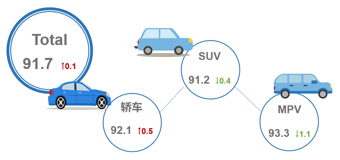 以2019年1月为基期,2022年12月整体市场产品竞争力指数为91.7,环比上升0.1个点;从三大细分市场来看,轿车市场环比上升0.5个点,SUV和MPV市场环比分别下滑0.4和1.1个点。