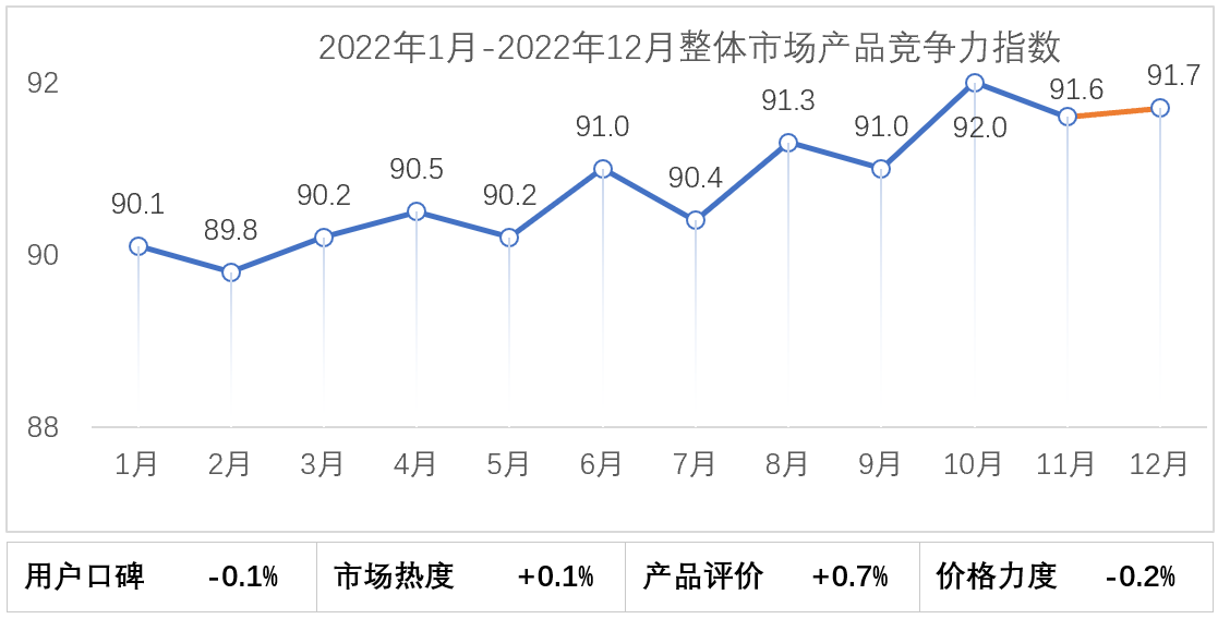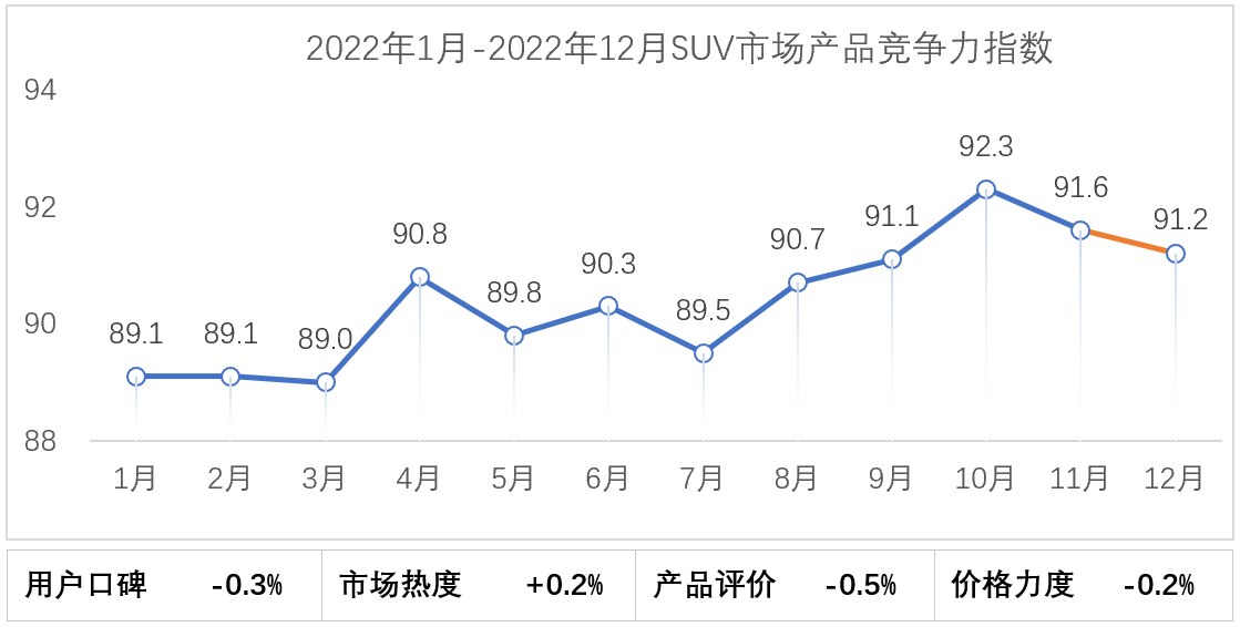 总体来看,2022年12月SUV市场产品竞争力指数为91.2,环比下滑0.4个点,其中产品评价、用户口碑和价格力度指标环比分别下滑0.5、0.3和0.2个点,而市场热度指标环比上升0.2个点。