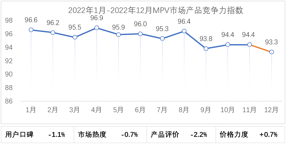 总体来看,2022年12月MPV市场产品竞争力指数为93.3,环比下滑1.1个点,其中产品评价、用户口碑和市场热度指标环比分别下滑2.2、1.1和0.7个点,而价格力度指标环比上升0.7个点。