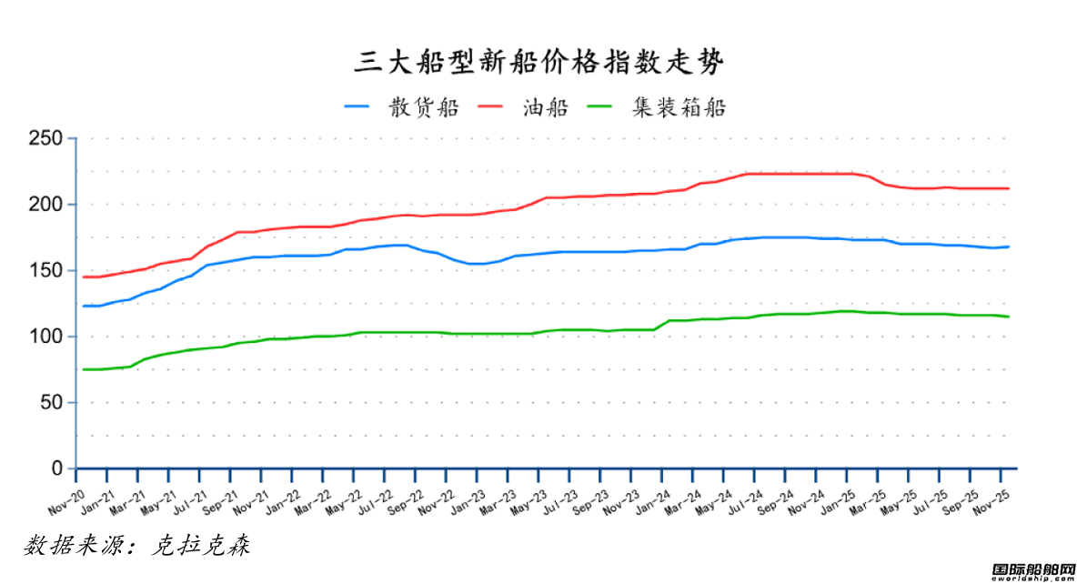 11月份散货船新船价格指数环比上升1点,为168点;油船新船价格指数环比持平,为212点;集装箱船新船价格指数环比下跌1点,为115点。