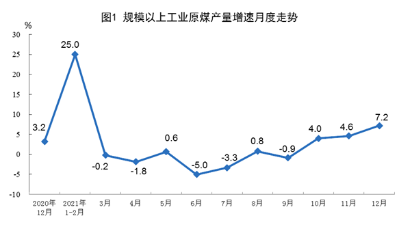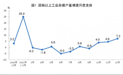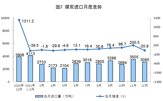 原煤生产继续加快,进口由增转降。随着增产保供政策持续推进,12月份,生产原煤3.8亿吨,同比增长7.2%,增速比上月加快2.6个百分点,比2019年同期增长10.7%,两年平均增长5.2%,日均产量1241万吨;进口煤炭3095万吨,同比下降20.8%。