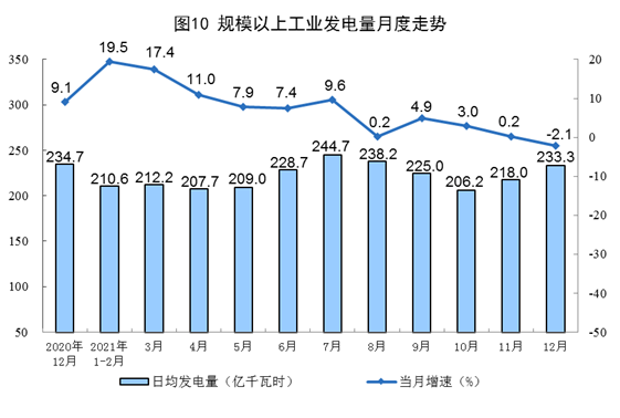 电力生产同比下降。12月份,发电7234亿千瓦时,同比下降2.1%,上月为增长0.2%,比2019年同期增长6.8%,两年平均增长3.4%,日均发电233.3亿千瓦时。2021年,发电81122亿千瓦时,比上年增长8.1%,比2019年增长11.0%,两年平均增长5.4%。