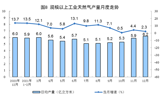 天然气生产放缓。12月份,生产天然气192亿立方米,同比增长2.3%,增速比上月放缓2.1个百分点,比2019年同期增长16.4%,两年平均增长7.9%,日均产量6.2亿立方米。