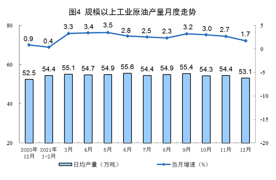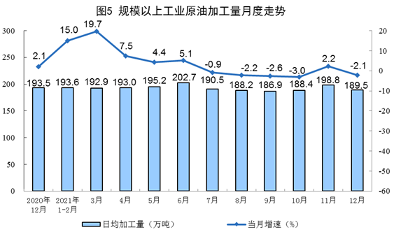 原油生产增速略有回落,加工量由增转降。12月份,生产原油1647万吨,同比增长1.7%,增速比上月放缓1.0个百分点,比2019年同期增长2.6%,两年平均增长1.3%,日均产量53.1万吨;加工原油5873万吨,同比下降2.1%,上月为增长2.2%,比2019年同期下降0.1%,两年平均下降0.1%,日均加工189.5万吨。