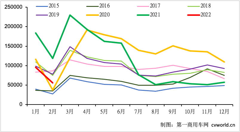 2月份过后,2022年前两个月的重卡市场累计实现销售15.1万辆,比上年同期的30.16万辆下降50%,减少了约15万辆。第一商用车网分析认为,造成2月份重卡市场同比较大下降的原因有三方面。首先,公路运输市场上车多货少、运费低迷、新车保有量过高、货源不足等现象依然存在,重卡企业对于今年上半年的市场预期相对不是那么乐观,因此,厂家和经销商在年前后备货的积极性远远没有去年同期那么高。