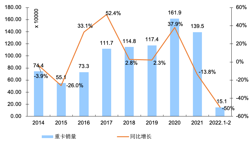 2014-2021年我国重卡市场销量年度走势图(单位:万辆)