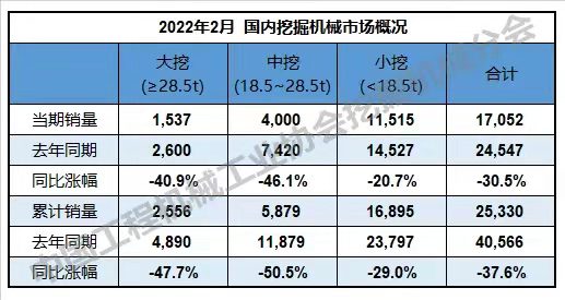 据中国工程机械工业协会对26家挖掘机制造企业统计,2022年2月销售各类挖掘机24483台,同比下降13.5%;其中国内17052台,同比下降30.5%;出口7431台,同比增长97.7%。