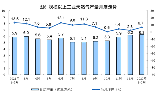 天然气生产保持增长,进口下降。1—2月份,生产天然气372亿立方米,同比增长6.7%,增速比上年12月份加快4.4个百分点,日均产量6.3亿立方米。进口天然气1986万吨,同比下降3.8%,上年12月份为增长4.6%。