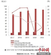 2021年,TOP500房企总资产均值为人民币(下同)916.78亿元,同比增长10.47%,增速较上年下降6.17个百分点;净资产均值为211.93亿元,同比增长18.52%,增速同比提升0.63个百分点。总体而言,它们的总资产规模维持增长,增速则是自2017年见顶后,连续4年下降;净资产同样保持增长,增速近3年保持稳定。