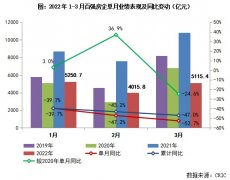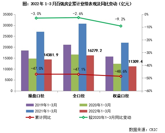 克而瑞研究中心数据显示,2022年3月,中国房地产行业下行压力持续,企业销售同比降幅较1、2两月进一步扩大。TOP100房企单月仅实现销售操盘金额5115.4亿元,环比增长27.4%,增幅明显低于往年同期;同比降低52.7%,较2月降幅扩大5.5个百分点;相比1月业绩规模降低2.6%。累计业绩来看,1~3月百强房企的整体业绩规模同比大幅降低47%,也低于2020年的同期水平,一季度开局惨淡。