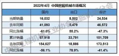 据中国工程机械工业协会对26家挖掘机制造企业统计,2022年4月销售各类挖掘机24534台,同比下降47.3%。其中,国内16032台,同比下降61%;出口8502台,同比增长55.2%。