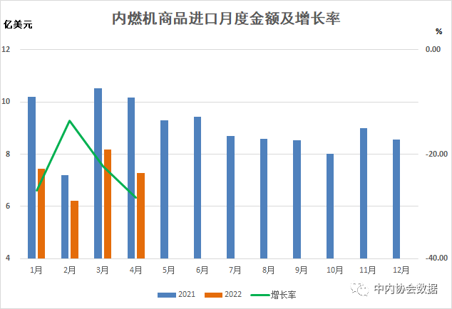 在进口金额中,除发电机组同比增长外其余各类均为下降,特别是汽油机下降较大。具体为:2022年1-4月柴油机进口2.91亿美元,同比下降5.45%;汽油机进口2.26亿美元,同比下降55.10%;其他类整机进口8.94亿美元,同比下降19.94%;内燃机零部件进口13.56亿美元,同比下降23.09%;发电机组进口1.45亿美元,同比增长24.05%。