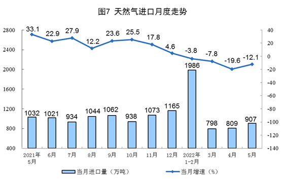 天然气生产保持稳定,进口降幅收窄。5月份,生产天然气177亿立方米,同比增长4.9%,增速比上月加快0.2个百分点,日均产量5.7亿立方米。进口天然气907万吨,同比下降12.1%,降幅比上月收窄7.5个百分点。