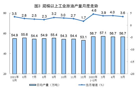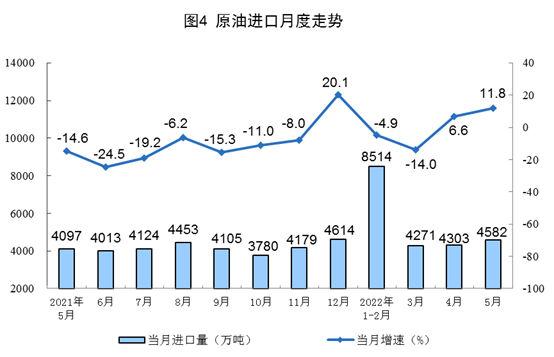 原油生产平稳,进口有所加快。5月份,生产原油1757万吨,同比增长3.6%,增速比上月放缓0.4个百分点,日均产量56.7万吨。进口原油4582万吨,同比增长11.8%,比上月加快5.2个百分点。