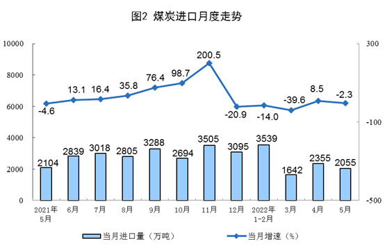 原煤生产保持较快增长,进口由增转降。随着煤炭保供稳价政策深入推进,原煤生产继续保持较快增长。5月份,生产原煤3.7亿吨,同比增长10.3%,增速比上月放缓0.4个百分点,日均产量1187万吨。进口煤炭2055万吨,同比下降2.3%,上月为增长8.5%。