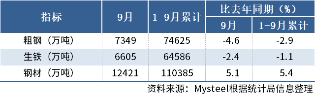 1-9月,中国粗钢产量74625万吨,同比下降2.9%;生铁产量64586万吨,同比下降1.1%;钢材产量110385万吨,同比增长5.4%。