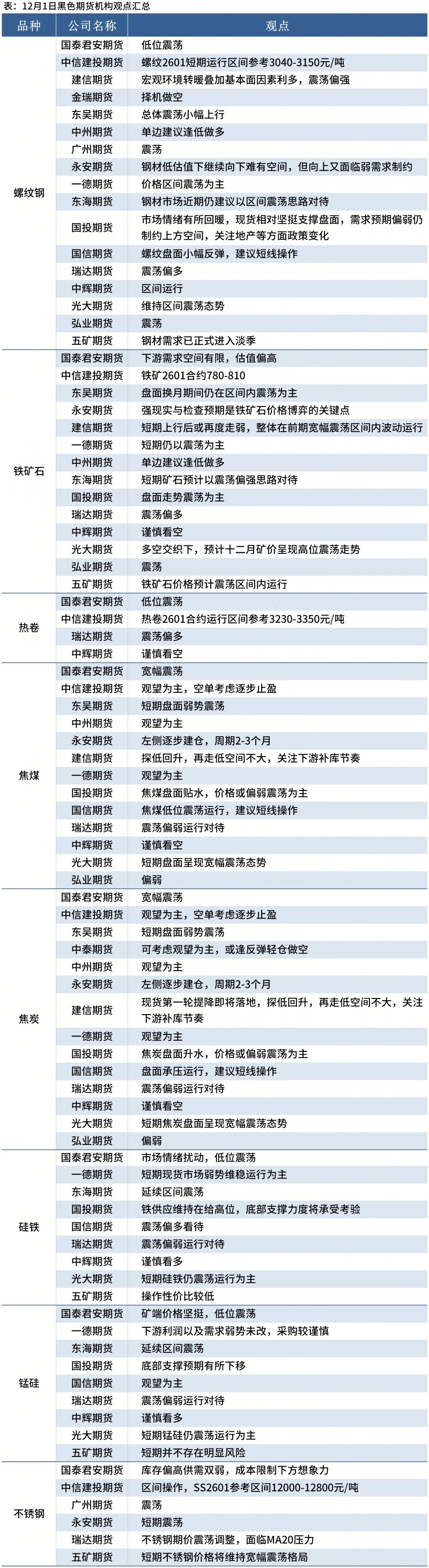 据Mysteel统计12月1日17家期货机构操作策略,其中多数机构料螺纹钢震荡运行,铁矿石震荡运行。具体汇总内容如下: