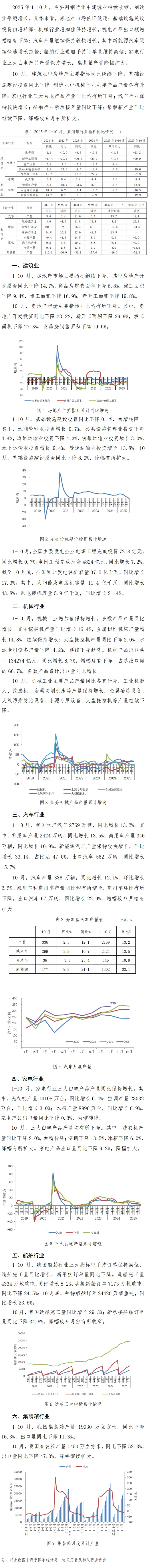 2025年1-10月,主要用钢行业中建筑业持续收缩,制造业平稳增长。具体来看,房地产市场依旧低迷;基础设施建设投资由增转降;机械行业增加值保持增长,机电产品出口额增幅略有下降;汽车产量继续保持较快增长,其中新能源汽车延续快速增长态势;船舶行业造船手持订单量维持高位;家电行业三大白电产品产量保持增长;集装箱产量降幅扩大。