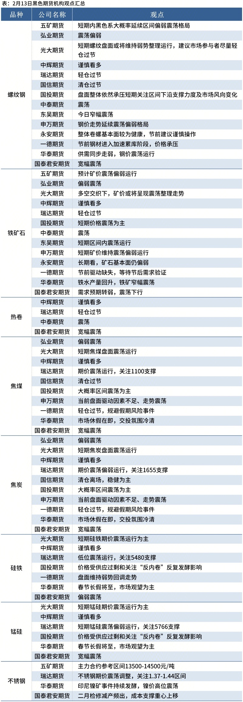 Mysteel统计2月13日14家期货机构操作策略,其中多数机构料螺纹钢震荡运行,铁矿石震荡运行。具体汇总内容如下: